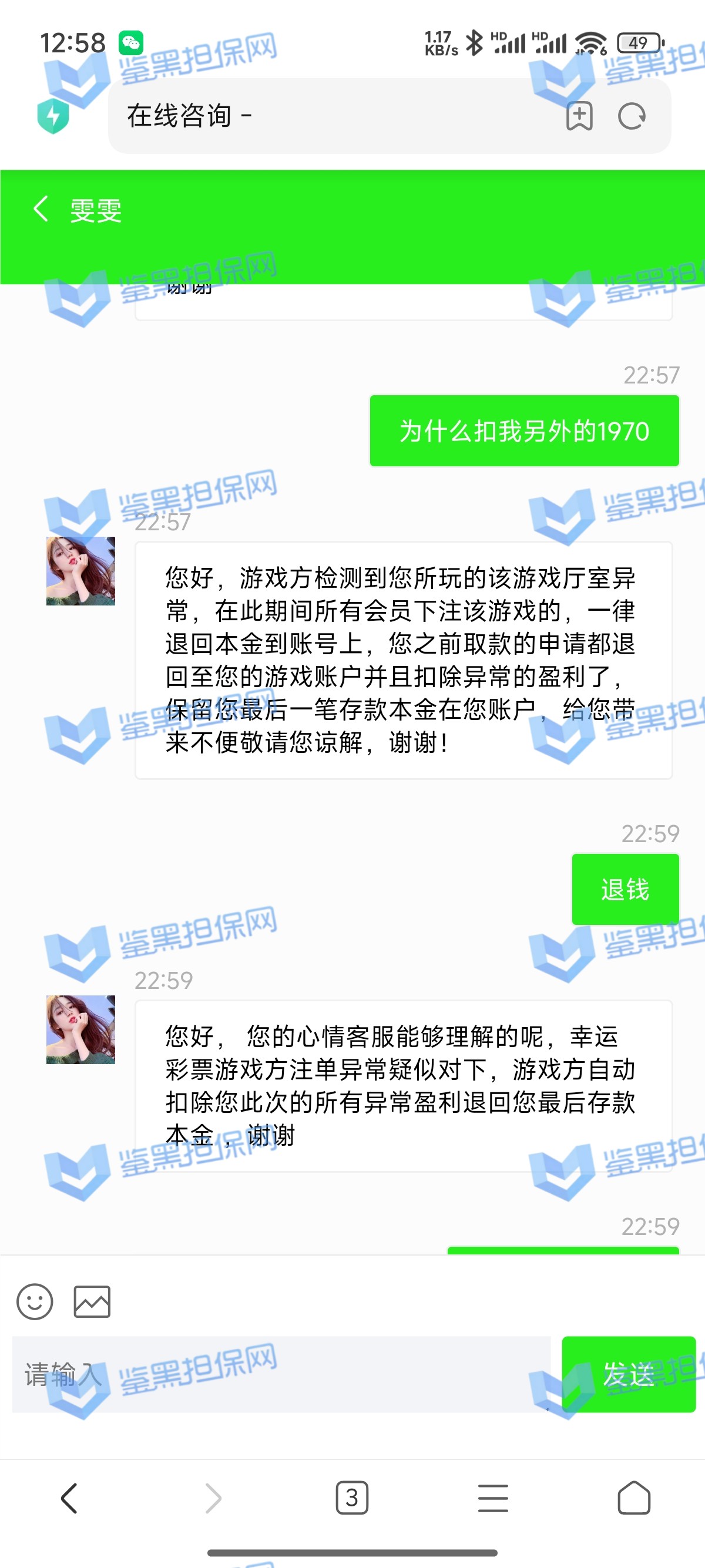 会员账号yangke0 3.10号充值800投注彩票正常投注盈利到6970提现5000账户还有1970然后被平台扣除了盈利部分退回800本金 客服告知游戏异常就平白无故的扣钱 态度极其恶劣