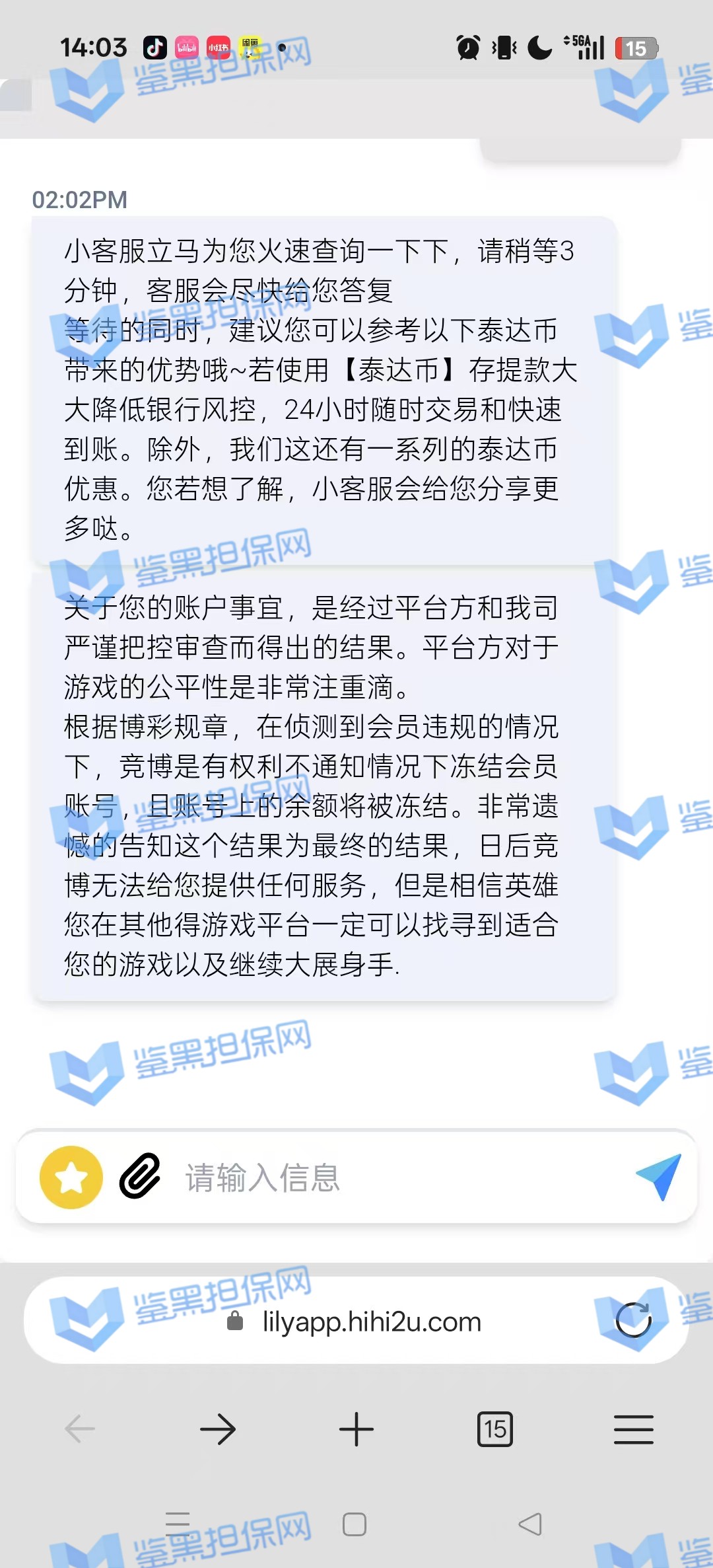 3、鉴黑担保网通过不同渠道与该平台相关负责人取得联系,关于这个会员的情况进行交涉,对方表示是风控部门检测到该会员的异常投注,扣除所有非法获利金额,按照游戏条例可在不通知的情况下进行冻结账号,维权专员让提供官方违规游戏进行复查核实,对方无法提供且拒绝更多交涉,本金也不愿意退回,可见是该会员盈利金额较多,平台找“借口”进行黑款,行为极其恶劣!!!