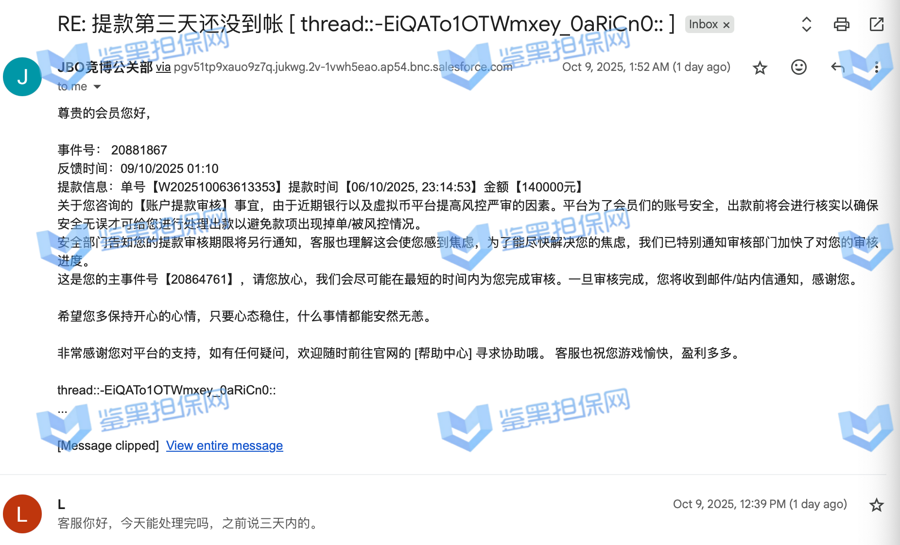 不出款并封禁账号,账号lanmfans,在竞博jbo平台一直投注体育和电竞,之前的存款提款都没出现过问题,在10月6号提款140000,是usdt提款方式,平时是秒提到账的。10月7到10月9号用帐户里剩下的2w多玩到了48w,因为现在登不上账号没办法提供投注截图和提款截图。只能提供跟客服的沟通记录和之前usdt存款进去的记录。