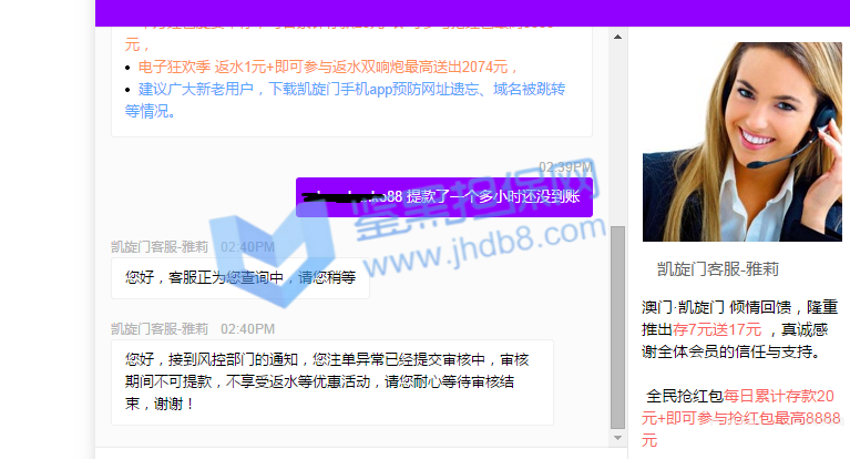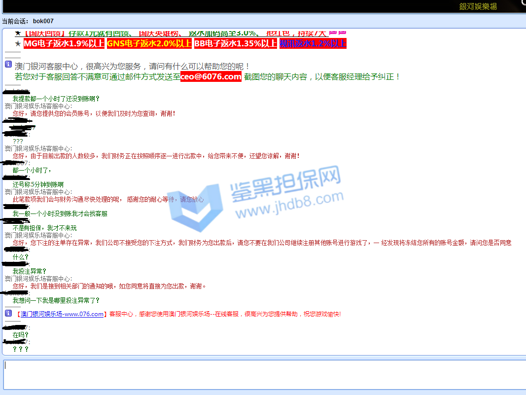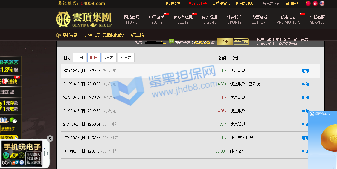 之前逛论坛的时候看到了亿鼎博,然后看优惠政策不错注册了在亿鼎博玩。玩了也快一年了,就在9月10月当天提款155438的时候被取消提款,并直接封禁账户。联系在线客服说稍后电话专员联系,电话专员电话打过来就只通知我账户系统检测出异常导致被封禁, 只退还最后一笔存款本金,让我尽快提款。账号后台直接给我扣款11万。后面我表示了对我账户异常原因表示了询问,电话专员表示他只负责告知这个结果,如果有疑问请与客服联系。后面我与娱乐城在线客服联系,也与微信客服进行联系,都只告诉我以专员致电内容,不告诉我账户异常原因,也不愿意进行和我沟通,就是互相踢皮球。后面我尝试去提款我账户本金8W5,可是依旧显示不能出款,仍需要打3w5流水。本人后面心态爆炸,后面8万5打百家乐3把全打没了。本人对亿鼎博娱乐城有两点最大异议:第一点:账号异常问题,只通知我账号异常,为什么异常,异常原因都不告诉我,只告诉我一个处罚结果,并一直不愿意与本人进行有效沟通,在线客服,微信客服,电话专员互相踢皮球。第二点:本金退还问题,只退还部分本金,本人是存了2笔存款共8万进行游戏后才提款一笔15万5,提过程中又存款一笔3万5,最后只退还提款前的最后一笔存款及提款过程中的那笔存款共8万5。讯问客服,客服说我第一笔存款后是进行游戏输掉的,可是我一直都是盈利的,中间输也就输了几千。 我现在游戏账户被封禁,更多游戏图片拿不出来。对于亿鼎博这种无理由黑钱的平台,大家千万不要去玩,服务态度差,黑钱还理直气壮。