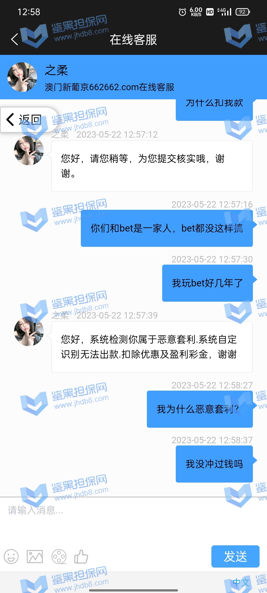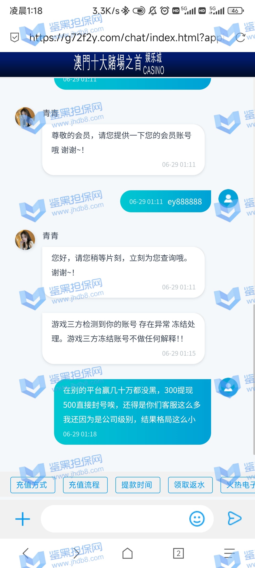 本人账号 ey888888 在6月27日注册的账号,马上就收到了电话回访,说让我参加首存50%,我充值了100领了50输掉了,次日6月28又收到客服电话邀请我再来参加50%,这次充了300 送了150,提现501,先是接到核实银行卡和个人信息,最后说核实完毕,由于我是第一次提现需要把虚拟币的地址发给POP软件的专员,POP这个软件是属于拉黑删除直接自动清空聊天记录的,本人有幸录过充值的视频,请看图1-图3 是和专员客服的聊天记录和充值记录,本人能提供3仅3天的3次的电话通话录音证明是他们电话特邀邀请充值的,本人的确在鉴黑担保网查过他们的官网没有记录当我打开pop聊天软件找专员的时候发个消息在吗聊天记录直接清空了还显示对方不是你的好友,当我重新登录平台的时候显示密码错误,直接修改客户会员的登录密码,找客服就说什么电子套利不做任何解释,本人仅3天都是只用流量进行游戏,玩了MG电子 和PG电子,本人只有一个账号 名下只有一张银行卡,没充值之前一口一个哥哥发那个语音夹子的说,还劳逸结合,有空再来,赢钱了提现直接相当于封号了,次平台多个POP专员 XX001 - XX0012 目前我知道有12个专员XX+后面的数字 001-012排序过去的,估计追回渺茫了,除非鉴黑团队能联系到比客服还高级别的管理。