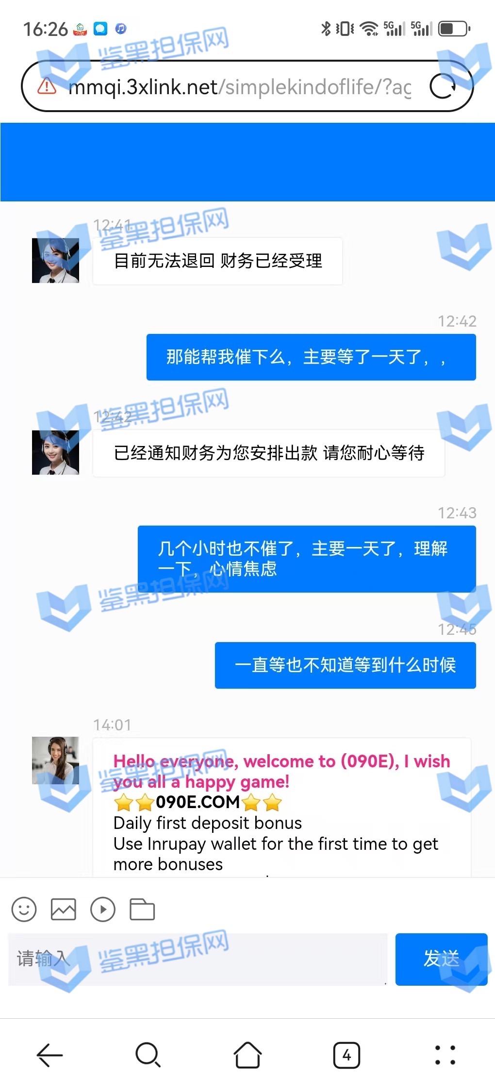 3、鉴黑担保网维权专员联系该平台核实情况,相关负责人表示财务繁忙,出款用户较多,需要依次处理,但是已过去2天时间且网站也没有发布提款繁忙公告通知玩家,维权专员沟通后要求尽快出款,对方表示会尽快处理。