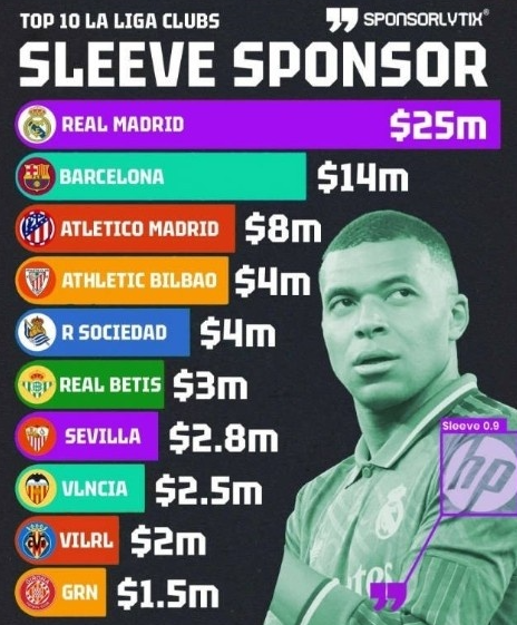 西甲中小球队的球衣“广告位”价值远逊于英超。