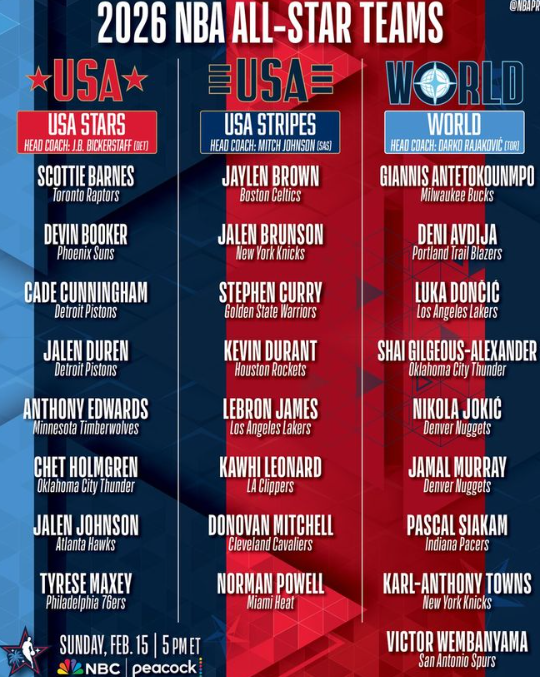 ESPN预测了东西部的首发与替补阵容——这份名单中将囊括铁定入选的全明星精英、首次入选的年轻新星,还有诸多令人纠结的选择。在这份预测名单上,五大国际巨星(亚历山大、约基奇、字母哥、东契奇、文班亚马)锁定首发,杜兰特和库里出现在替补位置上,而41岁的詹姆斯落选。
