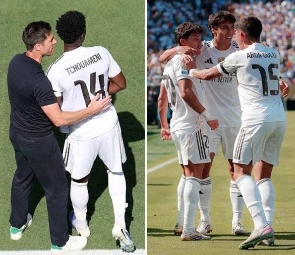 针对安切洛蒂时代后期的种种弊端,阿隆索采取了一系列措施,试图重新唤醒球员们的斗志。皇马在备战期始终坚持“一天两练”,球员们在场上的侵略性明显提升,就连姆巴佩这样的球员都开始积极参与反抢,居勒尔更是主动增重来提升对抗能力。考虑到大多数球员都没有踢三中卫阵型的经历,阿隆索放弃了自己擅长的蓝本,继续使用安切洛蒂留下的四后卫阵型。
